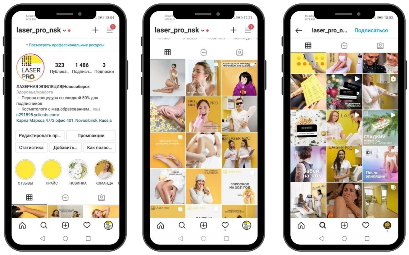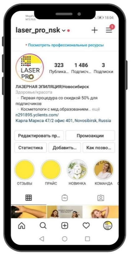 Оформили описание в шапке профиля, наполнили актуальные сторис по категориям услуг (эпиляция, Led маска.), а также другой информацией, необходимой покупателю (контакты, акции, отзывы, игры).