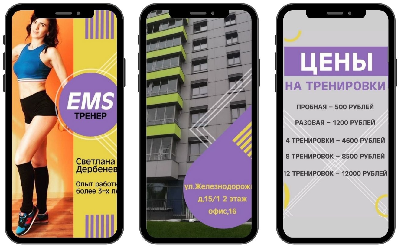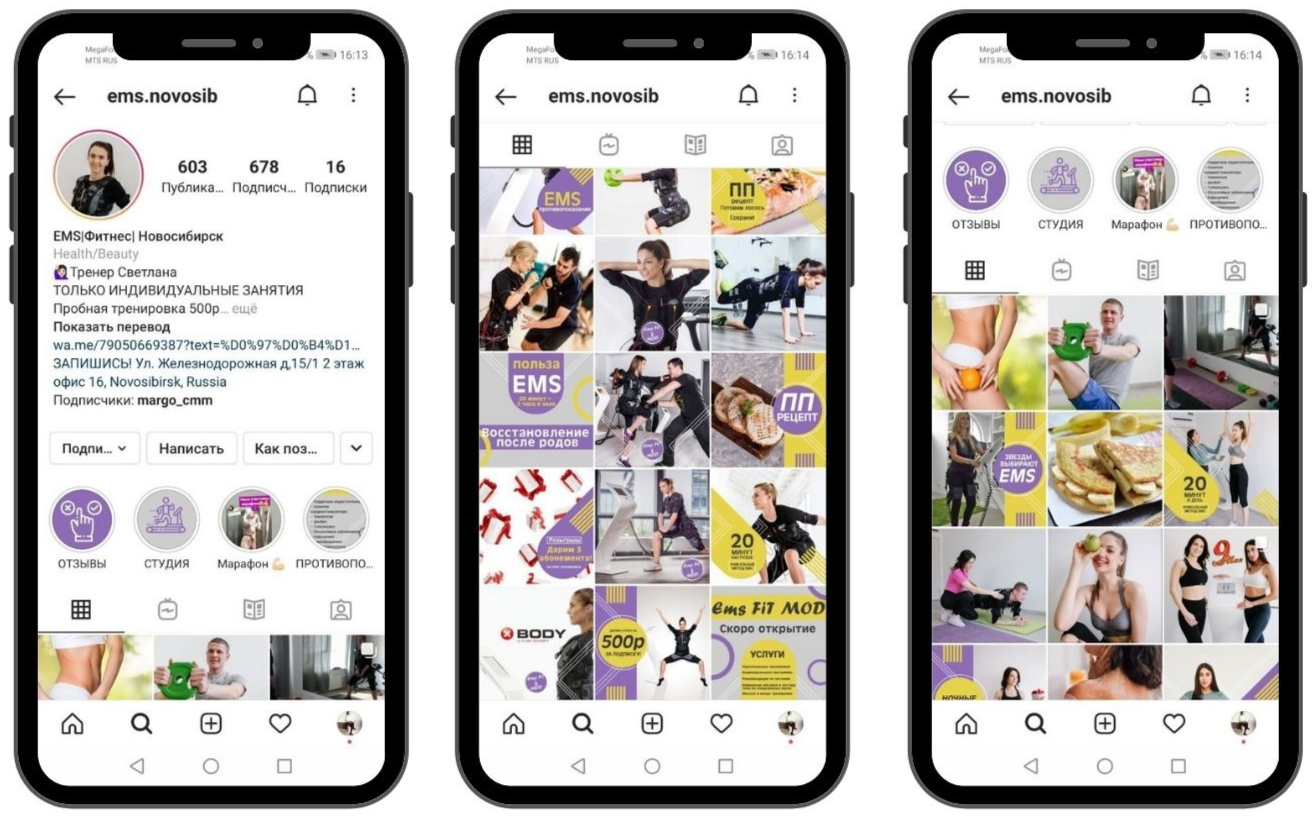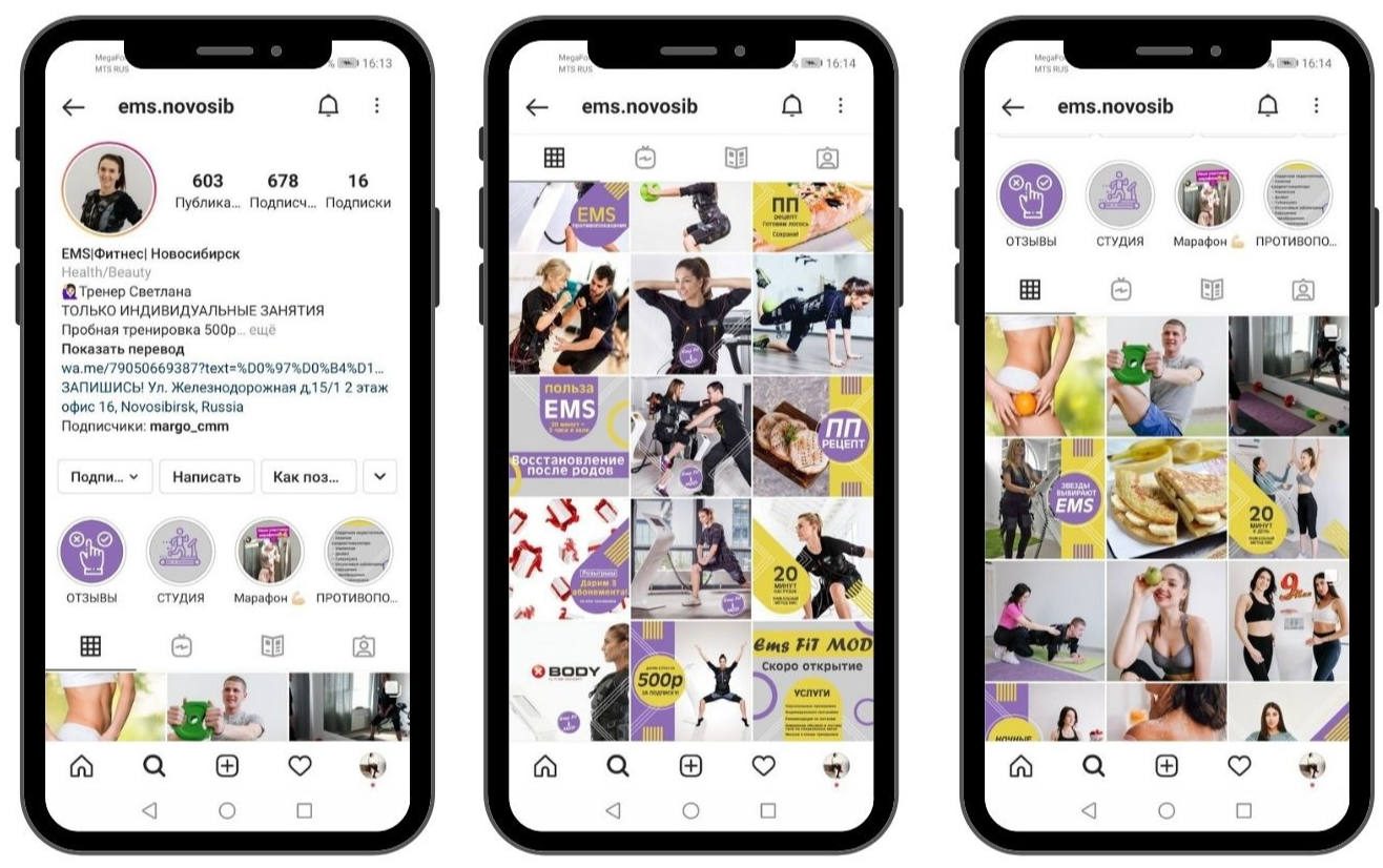 Оформили описание в шапке профиля, наполнили актуальные сторис по категориям услуги (противопоказания, прайс, тренировка, тренер), а также другой информацией, необходимой покупателю (контакты, адрес, отзывы, емс).